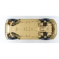 Typically, rear passengers do not have a separate door, reducing the likelihood of a successful escape for rear officers in an emergency. To facilitate evacuation in the event of an attack and rollover, a collapsible soft awning is installed in the roof window. In the model, we implemented a sculpted plastic removable roof with a fine weave pattern to simulate the texture of the fabric canopy. Once removed, figures can be placed in the back if desired.