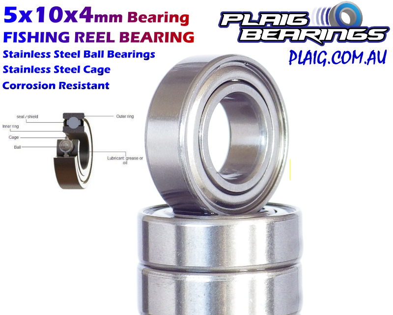 5x10x4mm Fishing Reel Bearing with Stainless Steel Balls & Cage, Contactless Metal Shields.