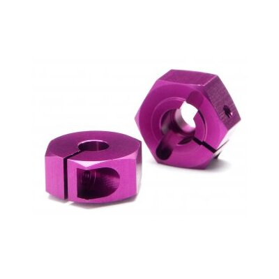 Beef up the drivetrain of your touring car and make wheel changes easier with a set of locking Aluminium Hex Hubs! These bright purple-anodized hex hubs securely clamp onto the axle and cross pin of your touring car, making sure they'll never come off like stock plastic hex hubs sometimes do. With the bright colour your car will look great in the pits while waiting for its next set of wheels to be bolted on, too! Supplied with 1.5mm Allen screws and wrench for quick removal and assembly.