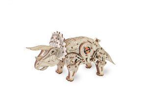 TRICERATOPS – mechanical wind-up 3D-puzzle of a real prehistoric animal that lived more than 65 million years ago. The walking dinosaur model is equipped with a rubber-band engine and freely movable head and tail.