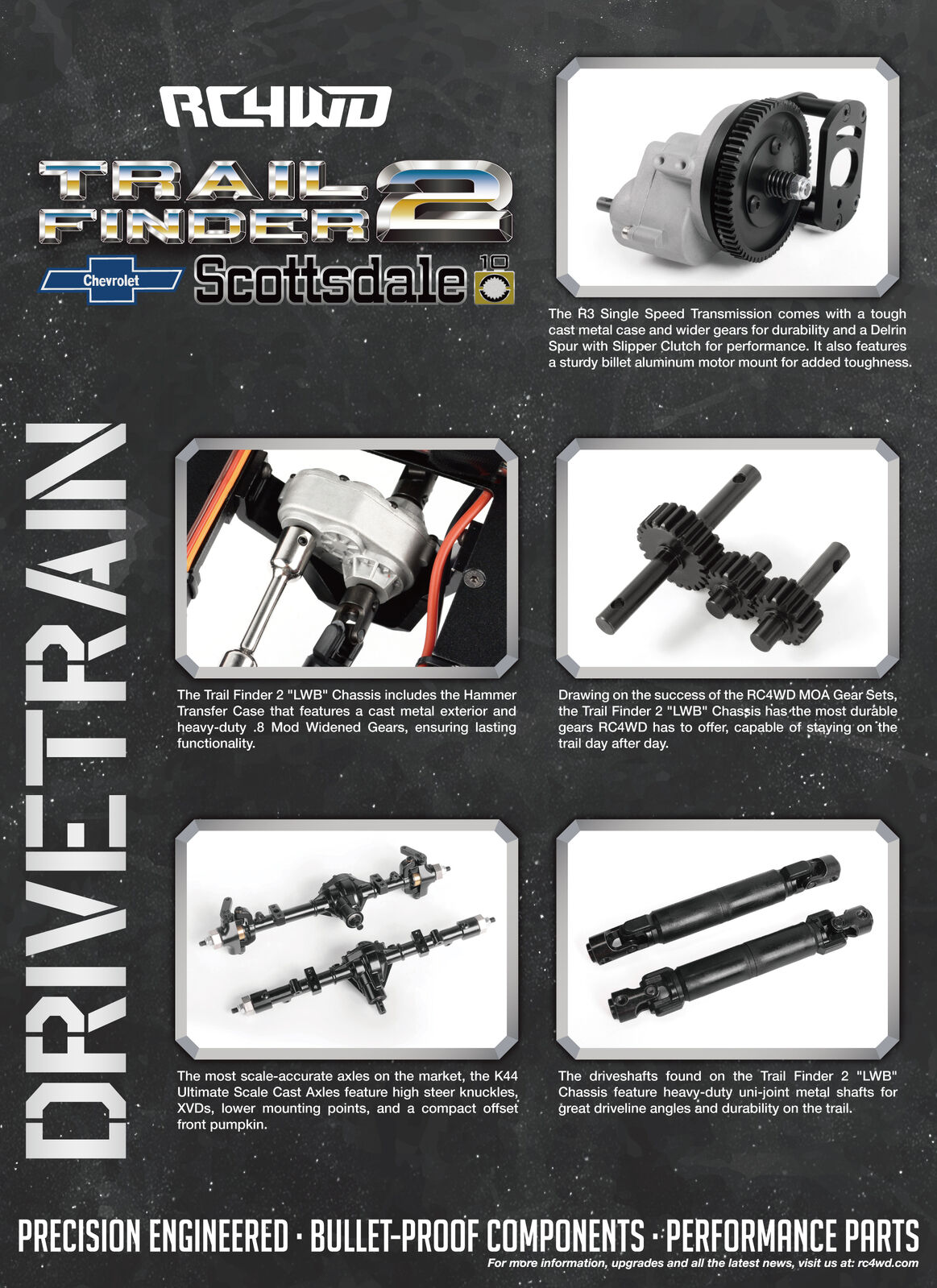 Drawing on the success of the RC4WD MOA Gear Sets, the Trail Finder 2 "LWB" Chassis has the most durable gears RC4WD has to offer, capable of staying on the trail day after day.