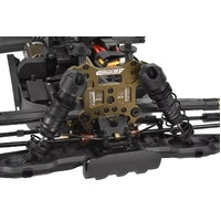 At the heart of the Kagama Limited Edition is its uncompromising 7075 aluminum backbone - a foundation engineered for extreme durability and precision handling. The gold-anodized 7075 aluminum chassis not only provides unmatched strength but also delivers an exceptional style. To further reinforce the structure, CNC-machined 7075 aluminum bulkheads lock the drivetrain in place, preventing unwanted movement and ensuring smooth, reliable power delivery, even under extreme loads. Meanwhile, the 6mm 7075 aluminum shock towers, paired with the new shock standoffs, provide rock-solid suspension support, allowing the proven Kagama shocks to absorb impacts consistently - no matter how hard you push the truck. Additionally, the 7075 Aluminum Servo Saver Bell Crank enhances steering precision and durability, ensuring direct and responsive handling in any driving condition.